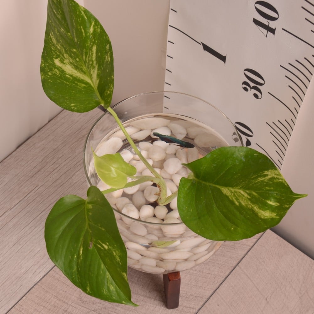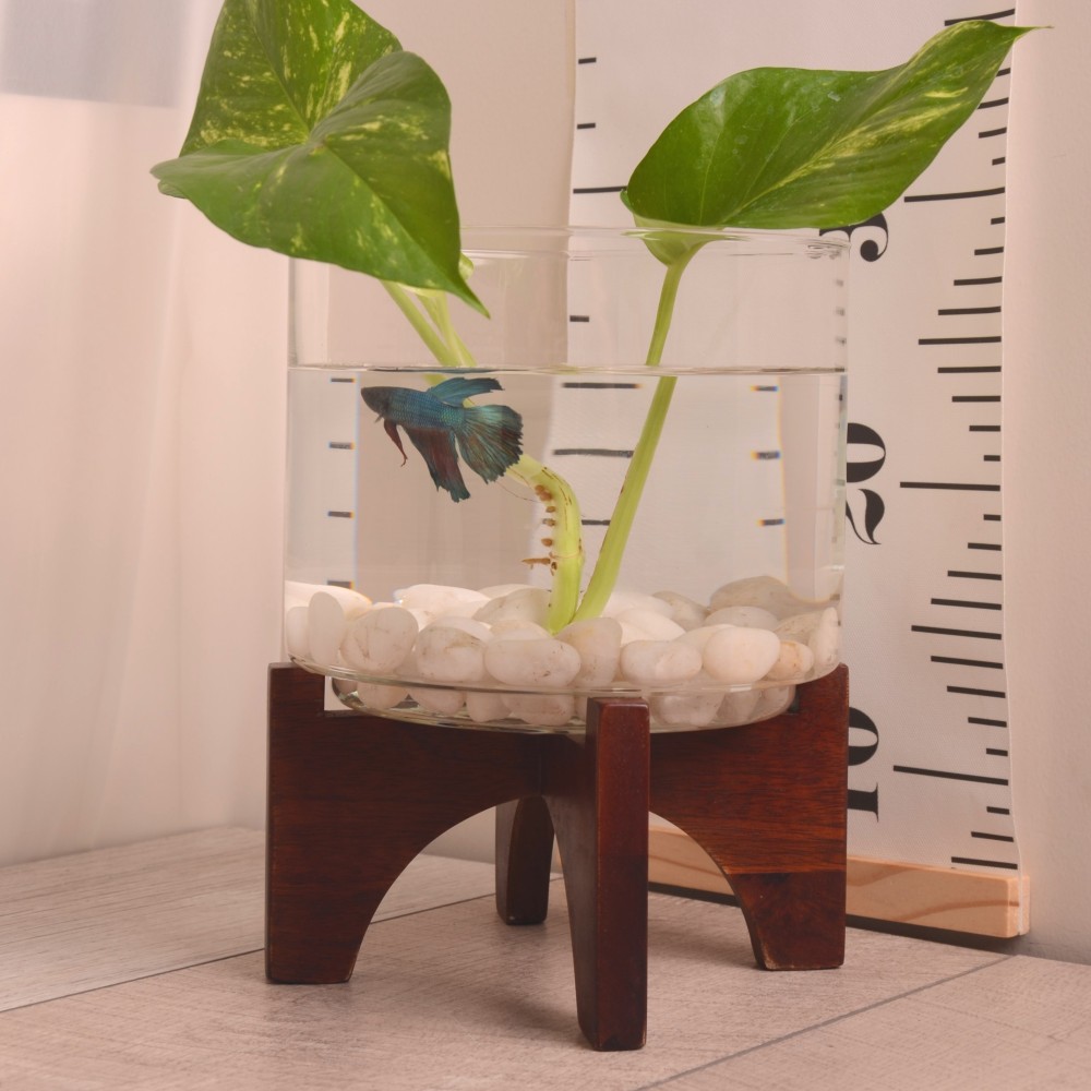 سمكة فايتر مع نبتة بوتس ،في وعاء زجاجي انيق ،مع قاعدة قوية من خشب المانجو الصلب، مزين بحصى أبيض.