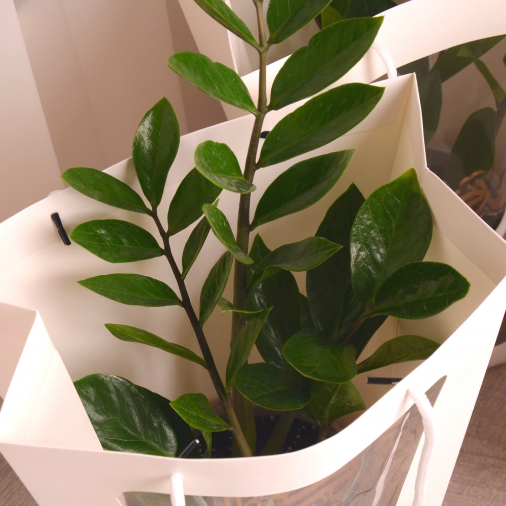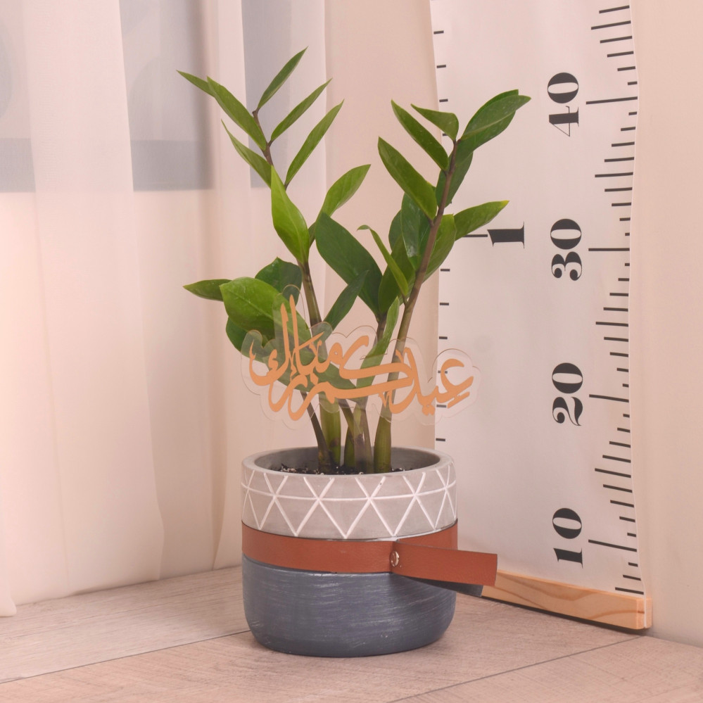 نبتة الزاميا القوية مع حوض مميز من السيراميك بلونيه الكحلي المزين بحزام جلد ,خيار مناسب للإهداء .