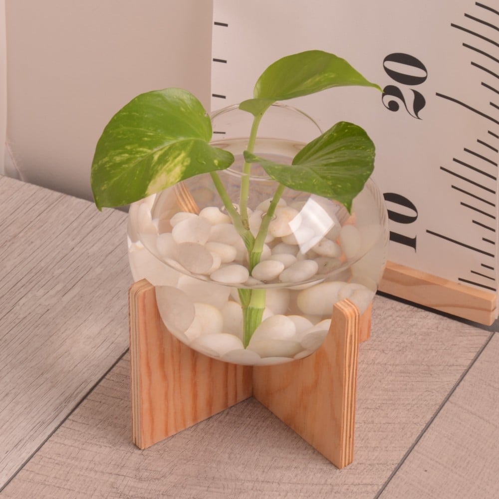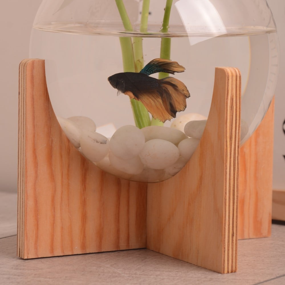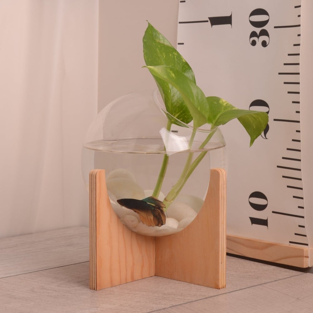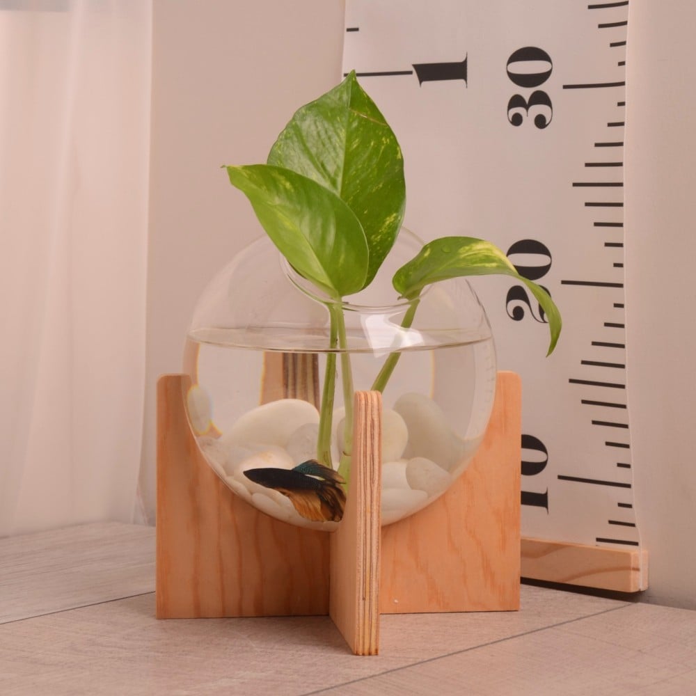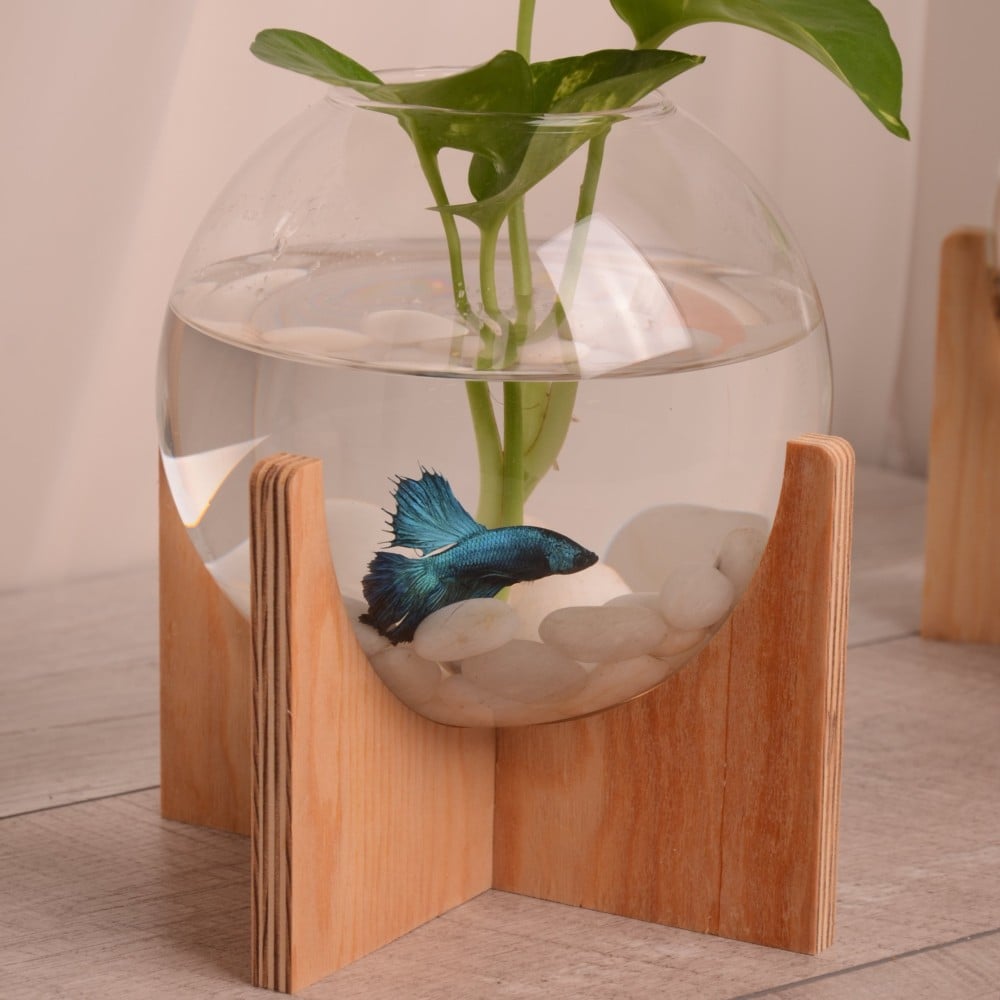 سمكة فايتر هافمون مع نبتة بوتس ،في وعاء زجاجي انيق ،مع قاعدة خشبية، مزين بحصى أبيض أو ملون.